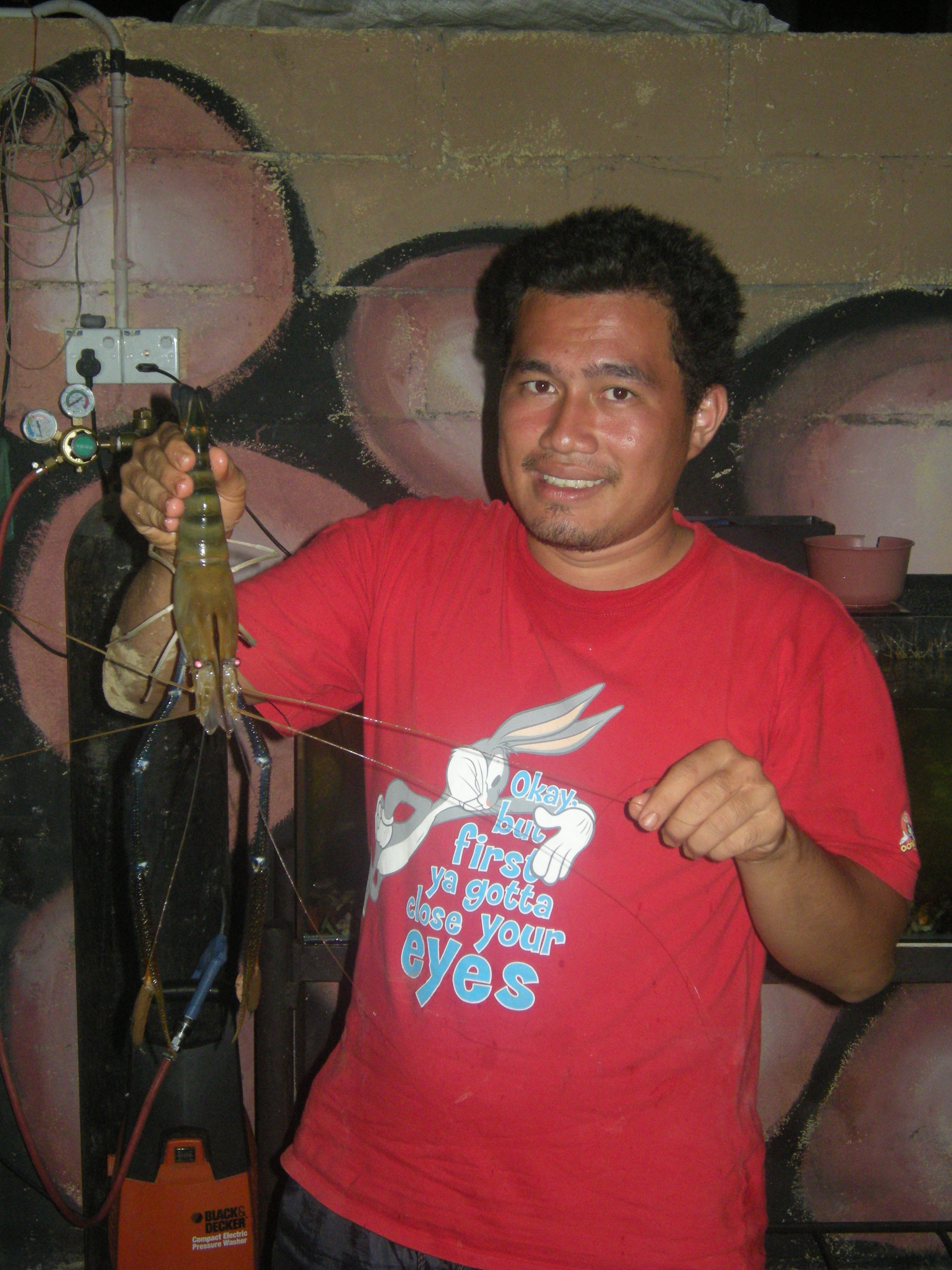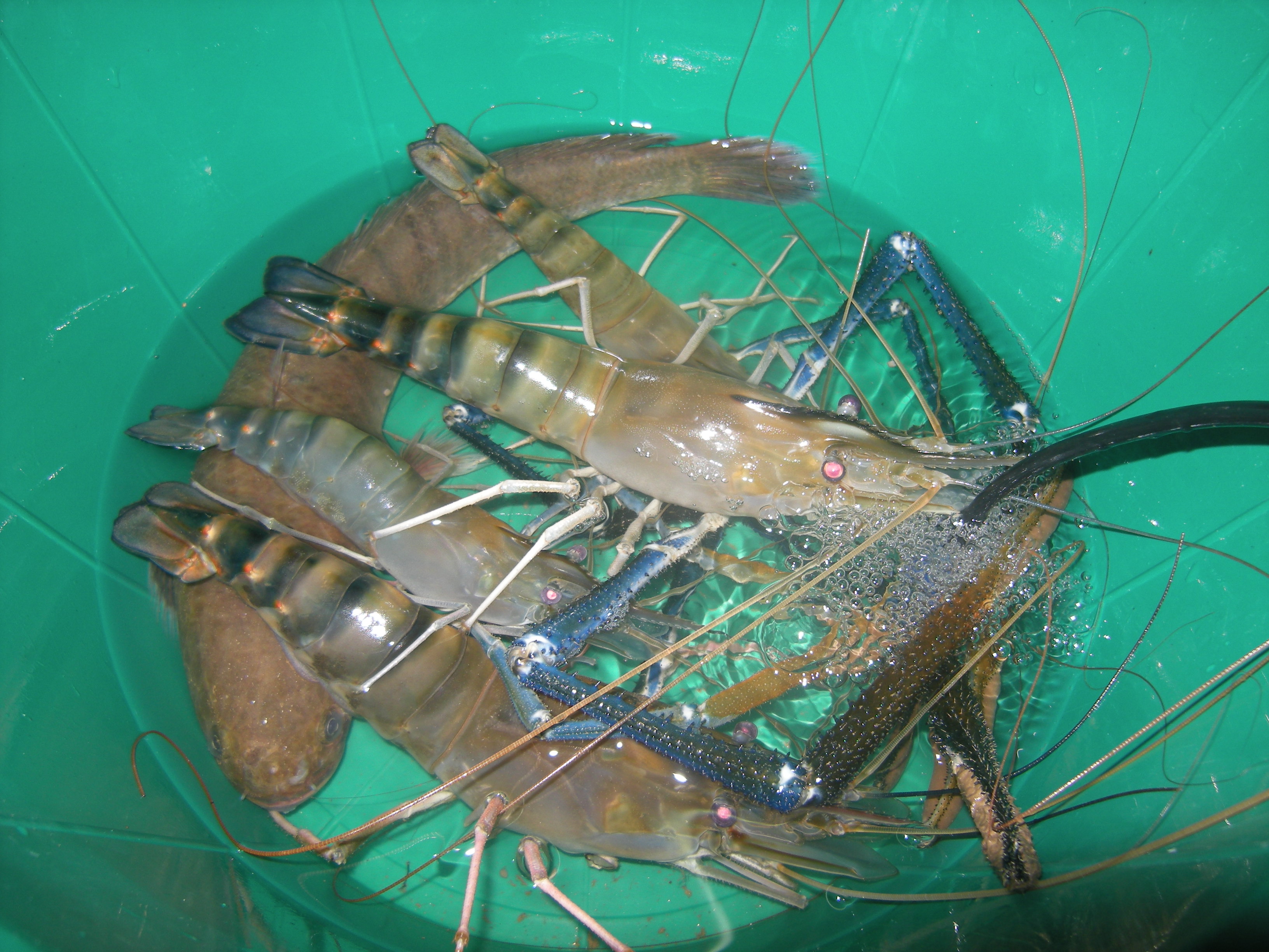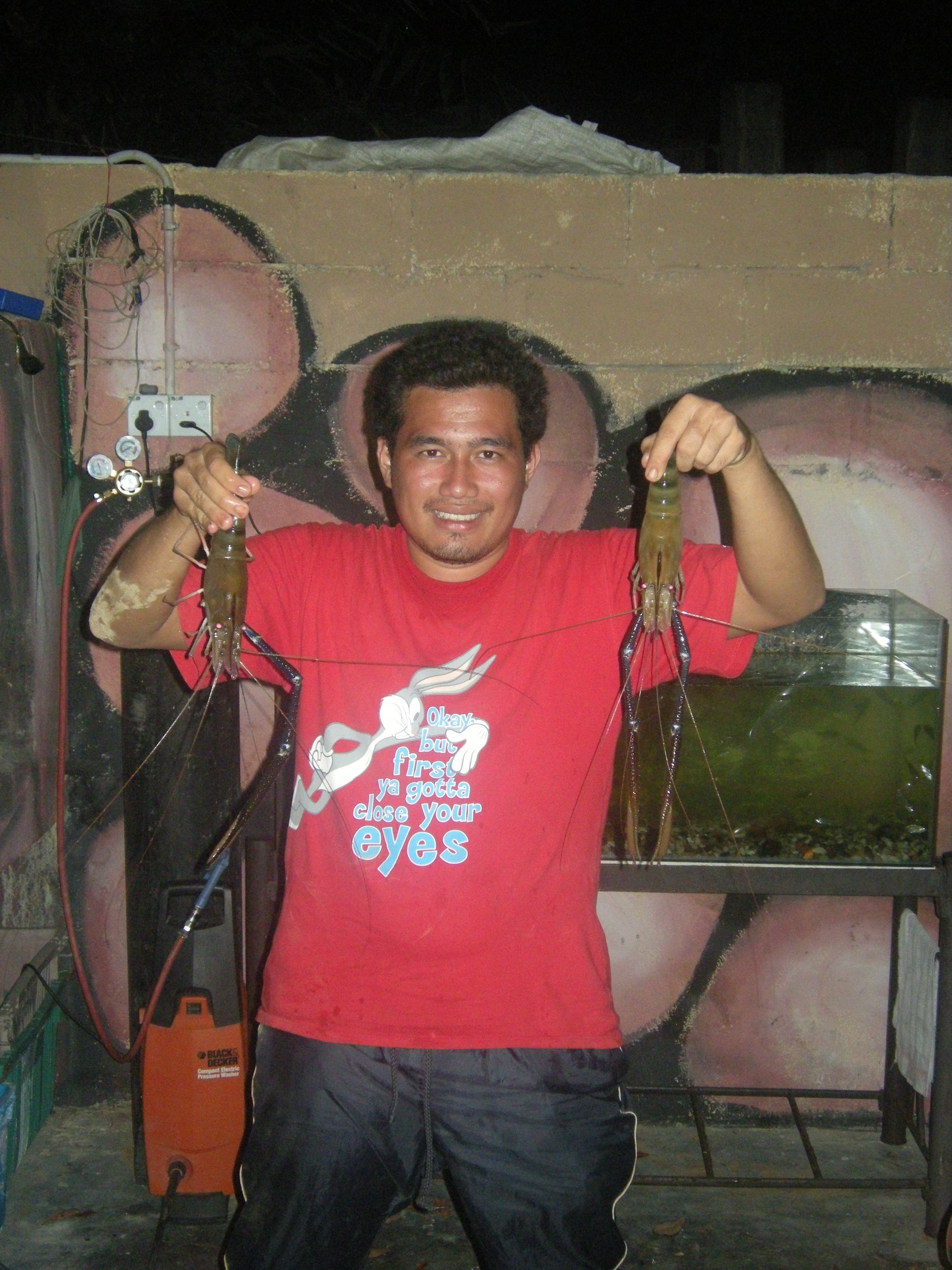 Gambar di bawah, Sdr Fadhil dengan 2 ekor daripada 11 ekor udang galah yang berjaya didaratkan hari ini. Esok boleh masak;)